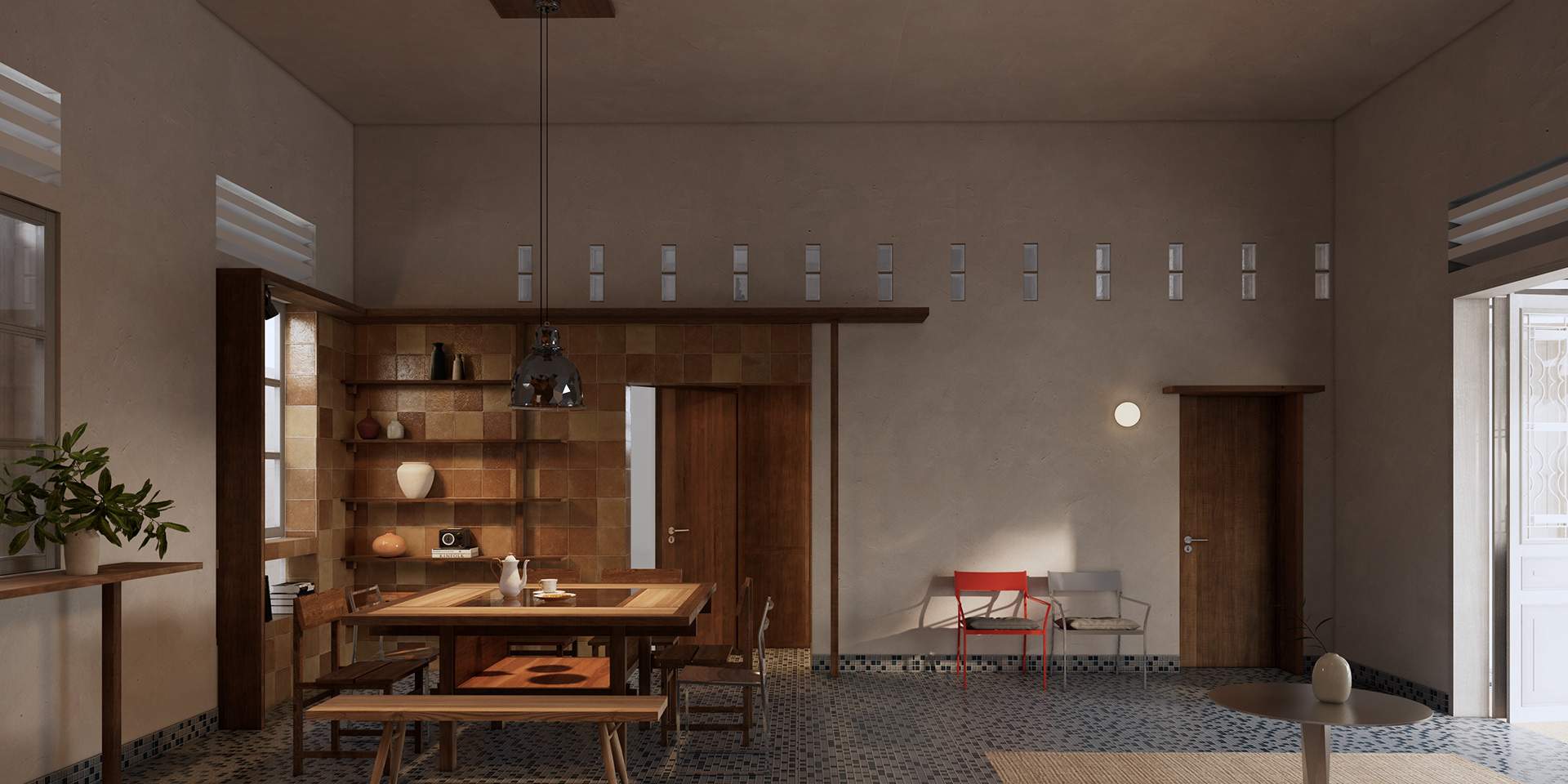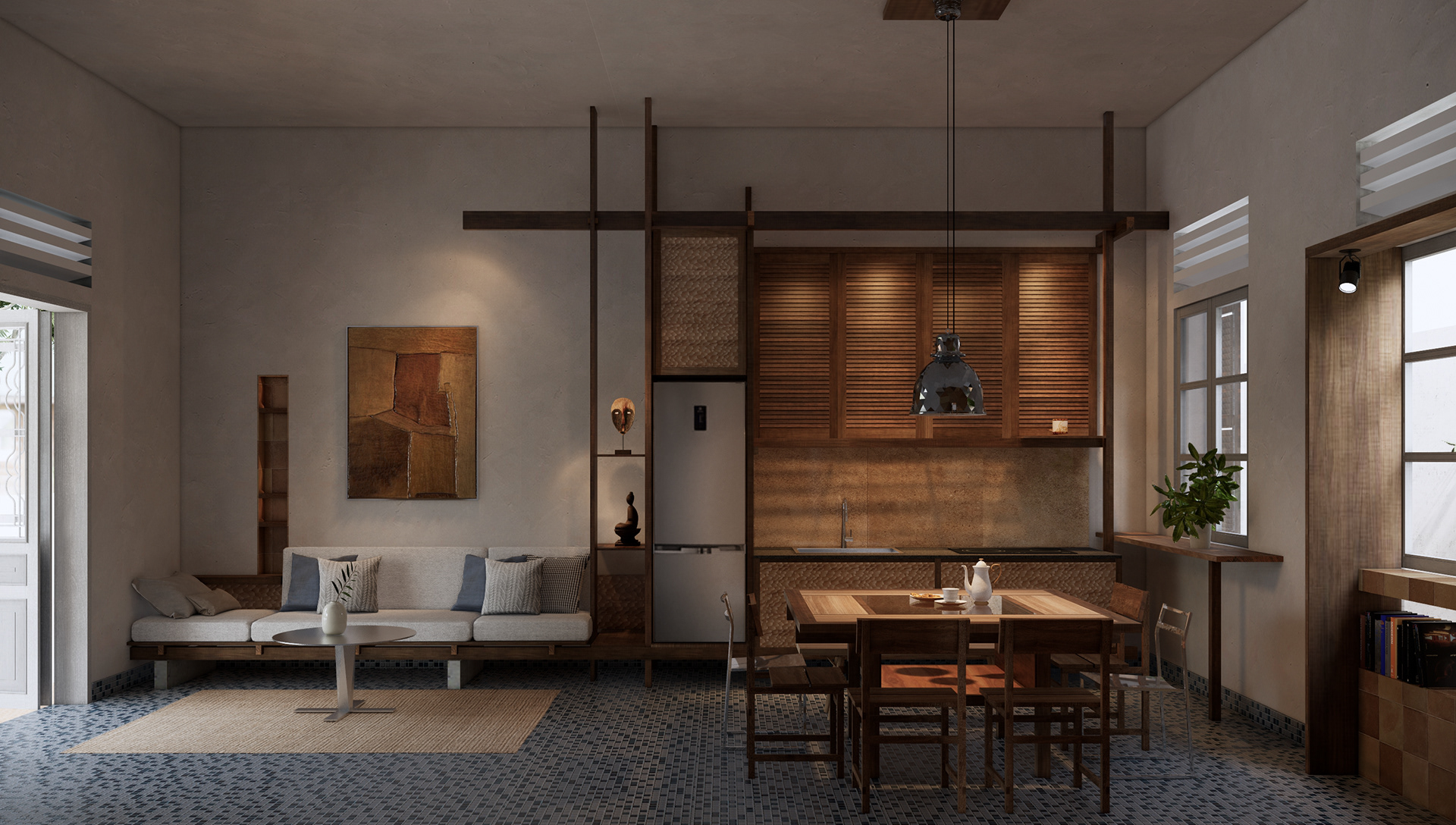 Trên quan điểm trân trọng những giá trị nguyên bản, phương án thiết kế ưu tiên giữ lại tối đa các yếu tố hiện trạng. Không gian mới được tính toán để tạo nên một cuộc đối thoại hài hòa giữa sắc xanh đặc trưng của nền gạch cũ và hệ thống cửa gỗ sẵn có. Lấy cảm hứng từ nét giản dị, bình yên của tâm hồn Huế, thiết kế khước từ việc lạm dụng các chi tiết hoài cổ nặng nề. Thay vào đó, chúng tôi chọn lọc tinh thần mộc mạc, tĩnh tại để đưa vào không gian, tạo nên một "nét Huế" đương đại — vừa quen thuộc, vừa mới mẻ.