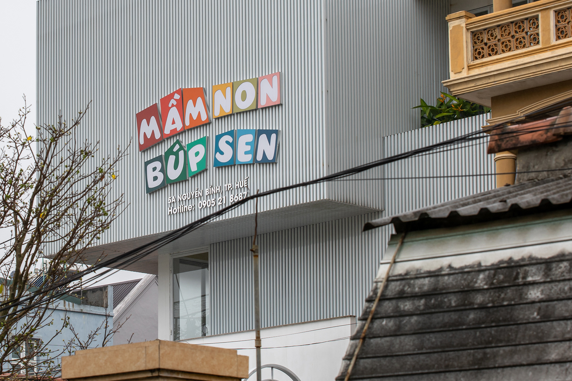 Dự án là một hành trình cải tạo đầy cảm hứng, biến một ngôi nhà theo lối kiến trúc chiết trung tại trung tâm thành phố Huế thành một không gian giáo dục mầm non hiện đại. Đối mặt với hiện trạng nằm trong con ngõ nhỏ ngoằn ngoèo và bối cảnh đô thị san sát, lộn xộn, nhóm thiết kế đã lựa chọn giải pháp tối giản hóa mặt đứng với tông màu trắng chủ đạo nhằm tạo ra một nhịp nghỉ thị giác nhẹ nhàng cho trục đường. Điểm nhấn ngoại thất nằm ở lớp vỏ bằng lam nhôm lấy cảm hứng từ các khối đồ chơi cubic gỗ xếp chồng, vừa mang lại diện mạo thông thoáng, vừa khơi gợi trí tưởng tượng cho trẻ nhỏ ngay từ cái nhìn đầu tiên.