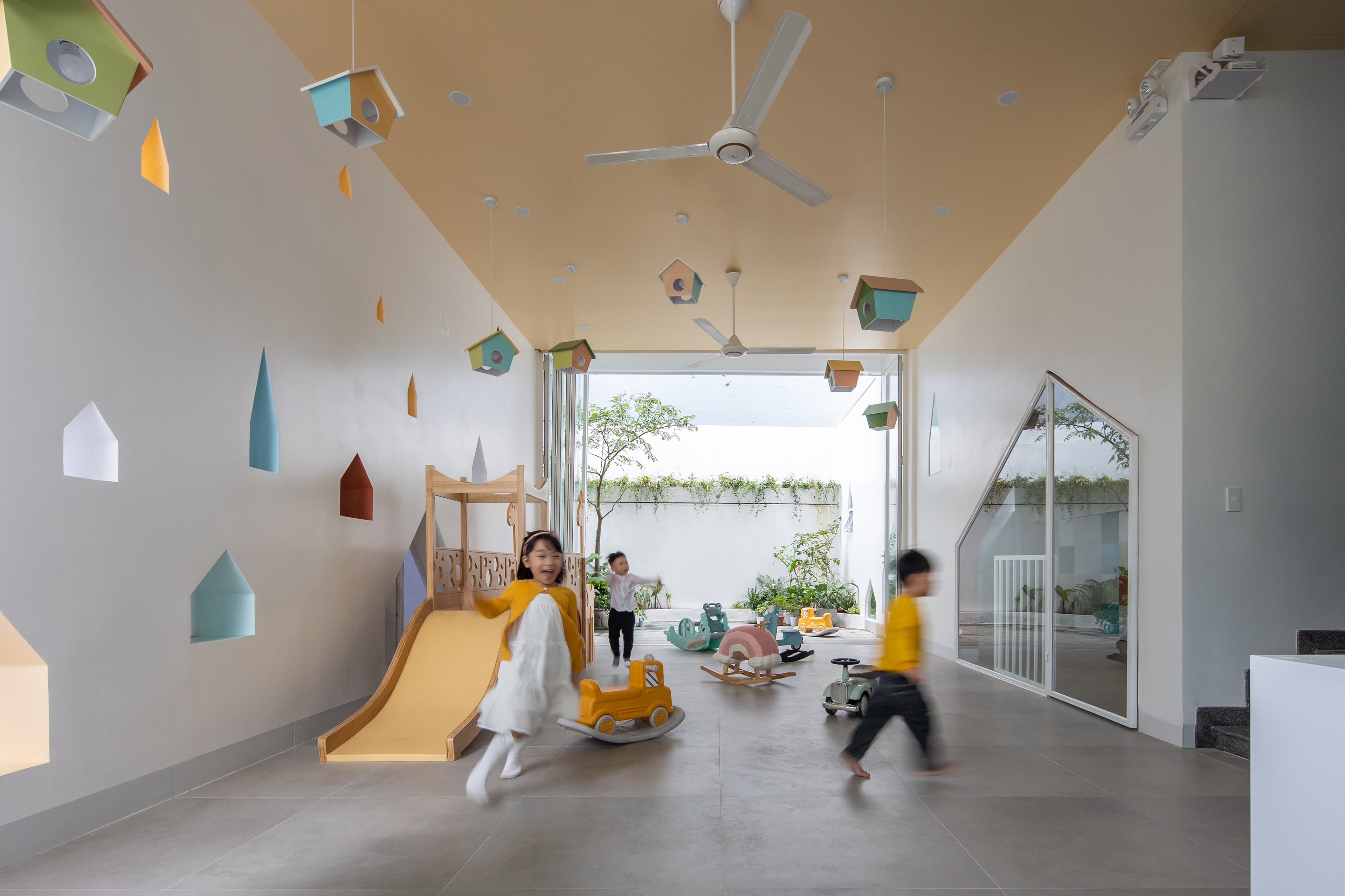 Về công năng, cấu trúc tổng thể của ngôi nhà cũ được giữ lại nhưng toàn bộ hệ thống tường ngăn được tái thiết lập để tạo ra 5 phòng học tối ưu cùng các khu vực phụ trợ tiện nghi. Điểm sáng trong thiết kế là sự kết nối xuyên suốt giữa sân chơi trong nhà và sân sau, không chỉ mở rộng không gian vận động mà còn thúc đẩy lưu thông gió tự nhiên, hạn chế tối đa việc sử dụng điều hòa không khí.
