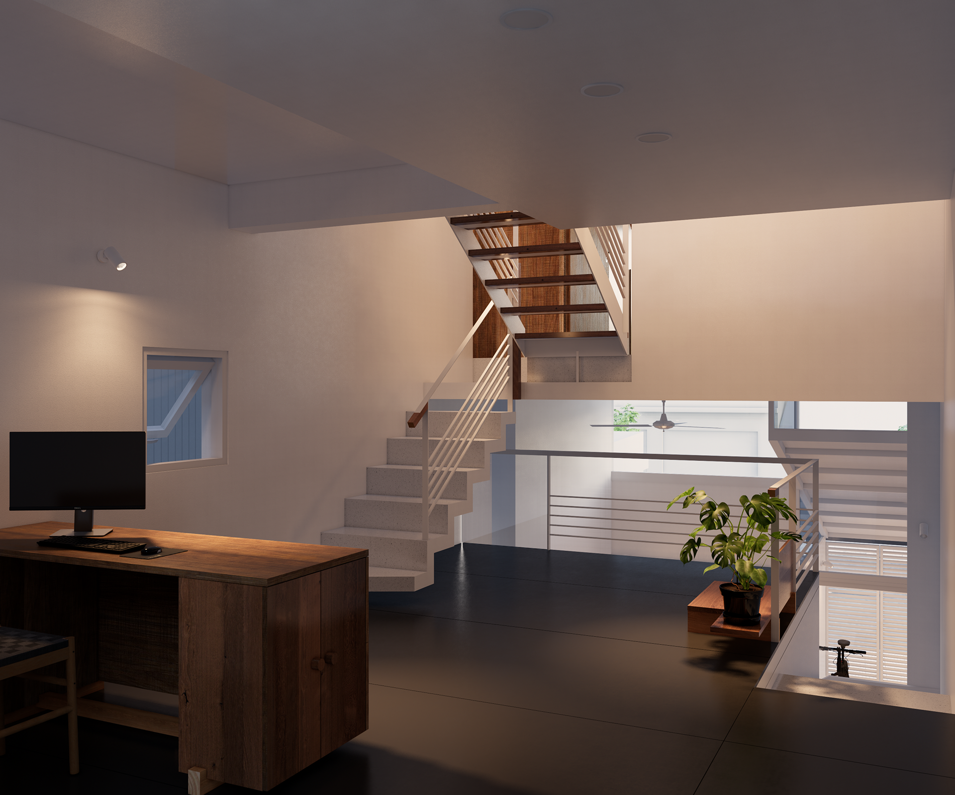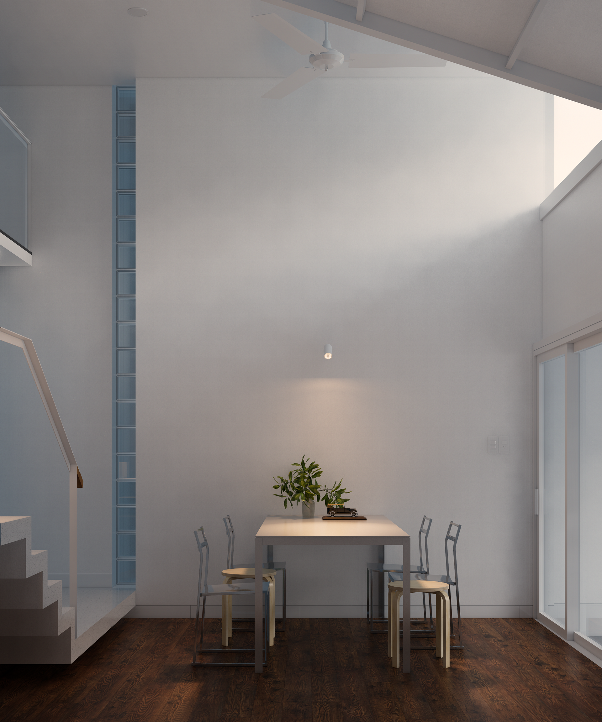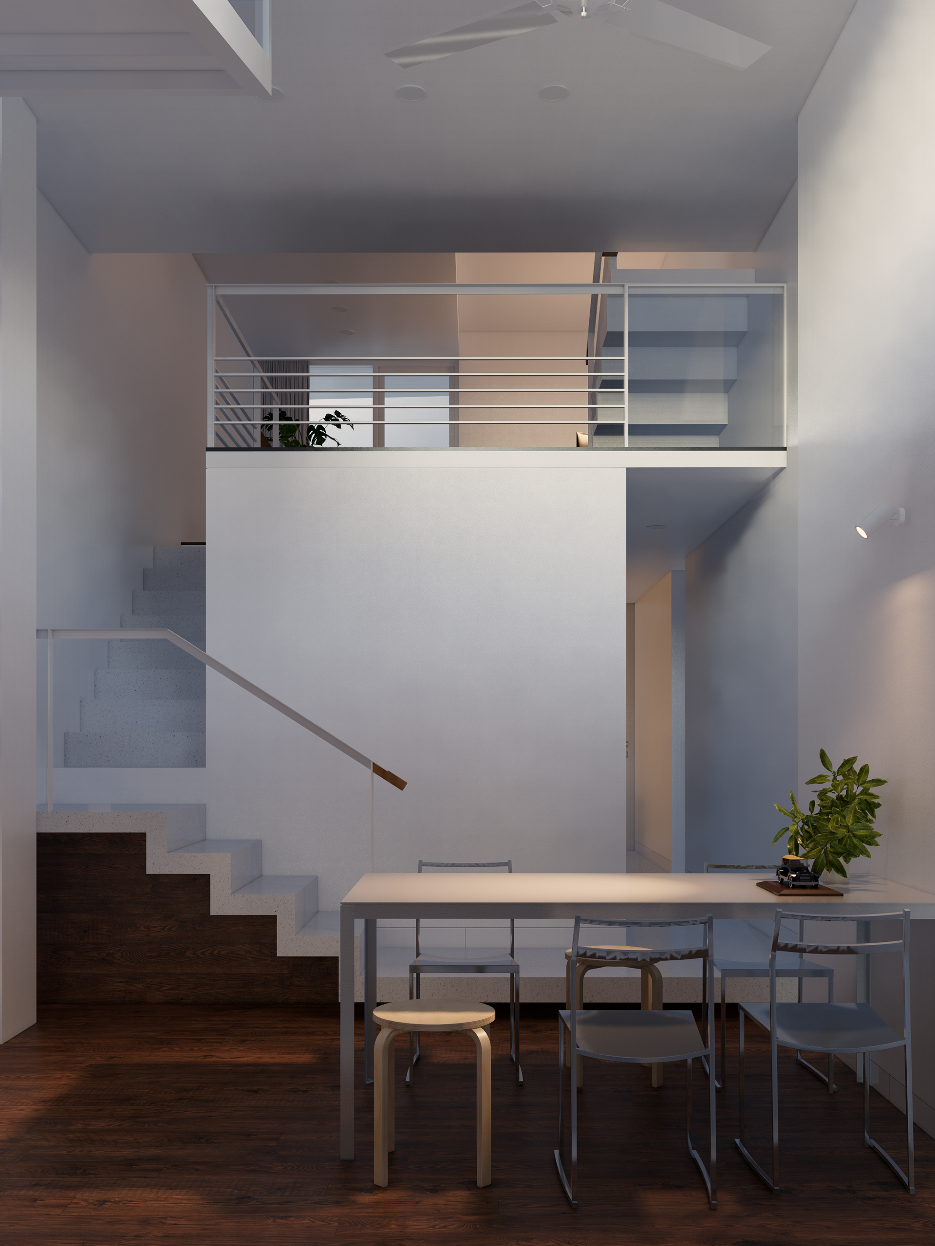 Ngôi nhà mang phong cách kiến trúc hiện đại và tối giản, nổi bật với sự kết hợp hài hòa giữa các mảng tường trắng tinh khôi và chất liệu gỗ tự nhiên ấm áp. Điểm nhấn của công trình nằm ở cấu trúc không gian lệch tầng với sự phân bậc cao độ khéo léo, kèm theo thông tầng nhỏ và vừa đủ tạo nên sự luân chuyển ánh sáng và không khí tuyệt vời. Đồ nội thất được tiết chế tối đa mang đến một không gian sống không chỉ để ở, mà còn để tận hưởng sự tĩnh lặng và tìm lại sự cân bằng sau những ồn ào của nhịp sống hiện đại.